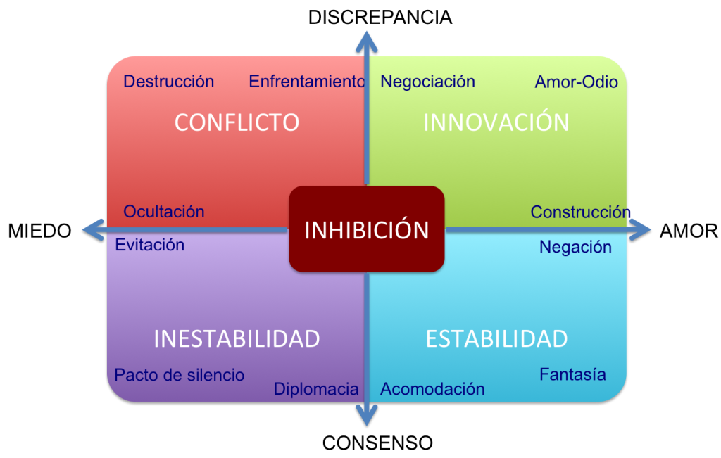 Con AMOR habrá armonía constructiva, que es el que corresponde al cuadrante INNOVACIÓN, es donde somos capaces de gestionar positivamente nuestra emocionalidad, aun estando en manifiesta DISCREPANCIA, para ello debemos desarrollar nuestras habilidades para gestionar la discrepancia. Sin embargo, habitualmente no somos competentes (ni nos han enseñado, ni estamos entrenados) para confrontar y abordar la libre y serena manifestación de nuestras diferencias con armonía, si no más bien tenemos tendencias a sentirnos mal cuando manifestamos nuestros desacuerdos, por miedo al rechazo o a la violencia.